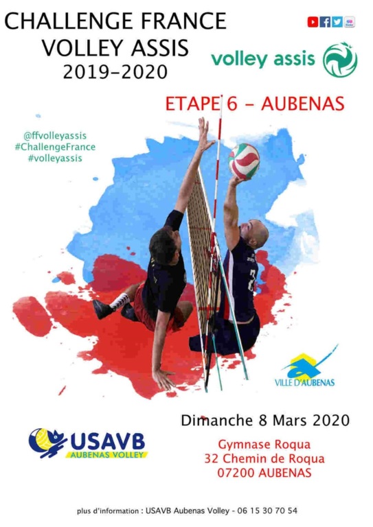 La 6e Etape du Challenge France Volley Assis, saison 2019/2020, aura lieu ce Dimanche 23 Février 2020 à AUBENAS (07)