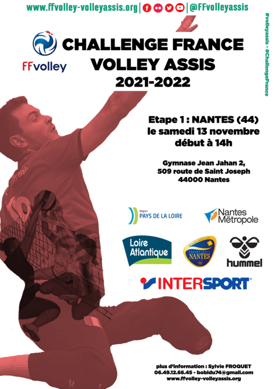 La saison 2021-2022 du Challenge France Volley Assis débute le Samedi 13 Novembre 2021 de 14h à 20h à Nantes au Gymnase Jean Jahan 2. Cette première étape est organisée par Volley-Ball Nantes Amateur.